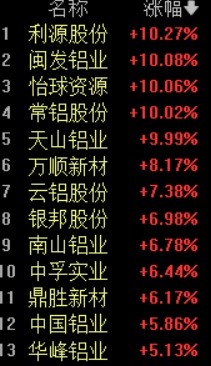 早盘,有色·铝板块大涨3.86%。板块内5只个股涨停,常铝股份、利源股份、天山铝业、闽发铝业、怡球资源涨停,万顺新材、云铝股份、银邦股份、南山铝业、中孚实业、鼎胜新材、中国铝业、华峰铝业涨超5%。