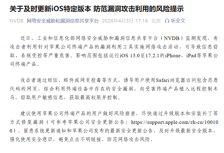 近日,工业和信息化部网络安全威胁和漏洞信息共享平台(NVDB)监测发现,有攻击者利用针对苹果公司终端产品的漏洞利用工具实施网络攻击活动,可导致信息窃取、系统受控等严重危害。影响范围包括运行iOS 13.0至17.2.1的iPhone、iPad等苹果公司终端产品。
